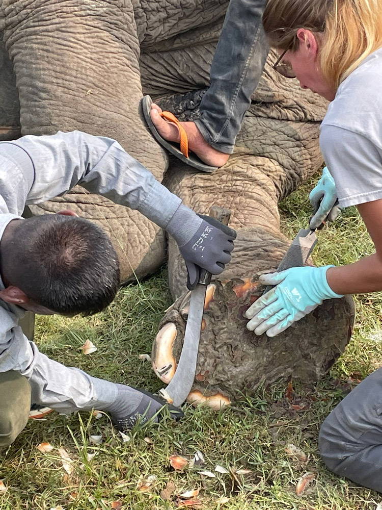The elephants are not sedated, they are trained to lie down and command for the foot trimmer. Perhaps something to consider for our cattle foot trimmers?!